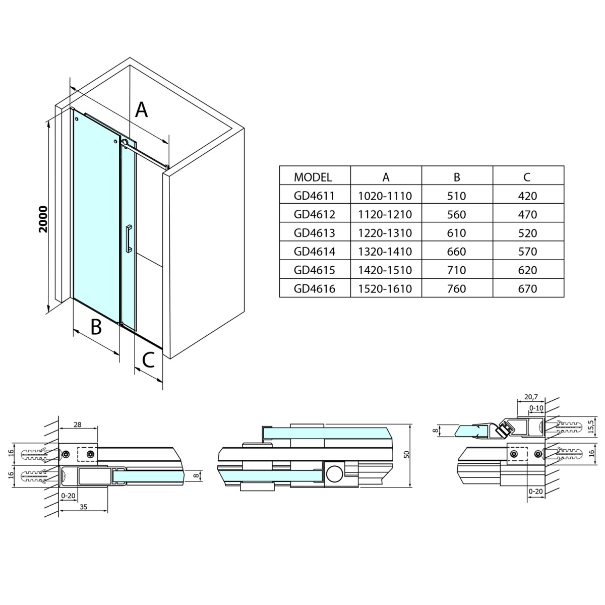 • Přístěnné profily jsou nastavitelné až o 15 mm a řeší tak nerovnosti stěn