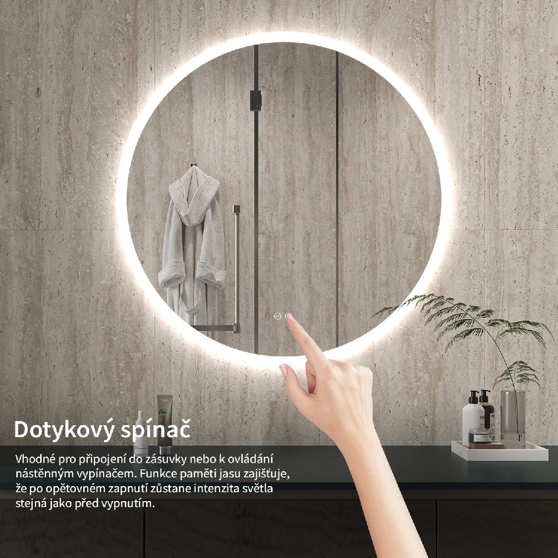 Osvětlení zrcadla lze snadno a pohodlně zapnout dotykem přepínače na panelu zrcadla. Umožňuje rychlé nastavení osvětlení bez nutnosti sahat po vzdálenějším tradičním vypínači.