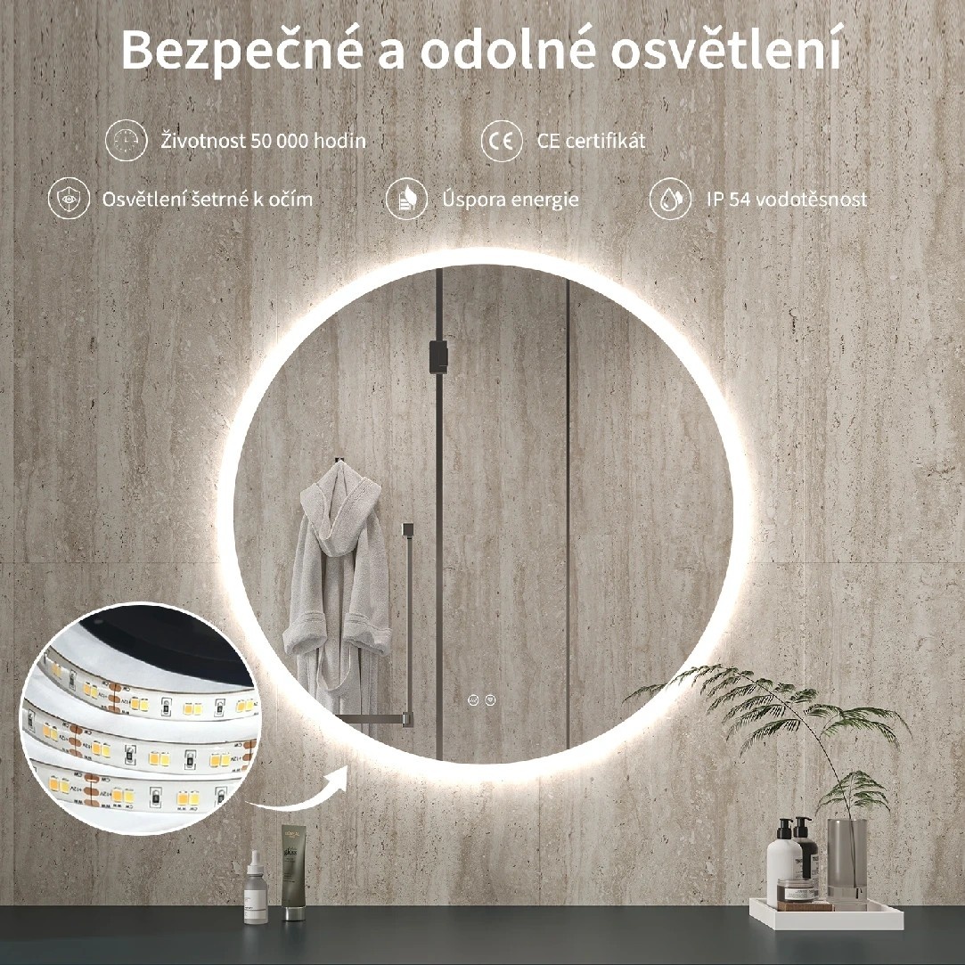 Zrcadlo je vybaveno LED osvětlením s nastavitelnou barvou světla – od 3000 K (teplá) do 6000 K (Neutrální). Přepínání barev jednoduše ovládáte dotykovým tlačítkem na ploše zrcadla. Poskytuje intenzivní a jasné světlo pro detailní péči i příjemné, jemné osvětlení pro relaxaci. Díky širokému rozsahu teploty barev tak snadno přizpůsobíte atmosféru aktuální potřebě.