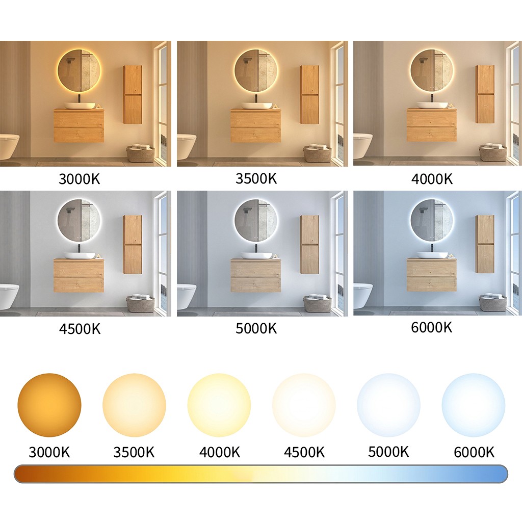 Zrcadlo je vybaveno LED osvětlením s nastavitelnou barvou světla – od 3000 K (teplá) do 6000 K (Neutrální). Přepínání barev jednoduše ovládáte dotykovým tlačítkem na ploše zrcadla. Poskytuje intenzivní a jasné světlo pro detailní péči i příjemné, jemné osvětlení pro relaxaci. Díky širokému rozsahu teploty barev tak snadno přizpůsobíte atmosféru aktuální potřebě.
