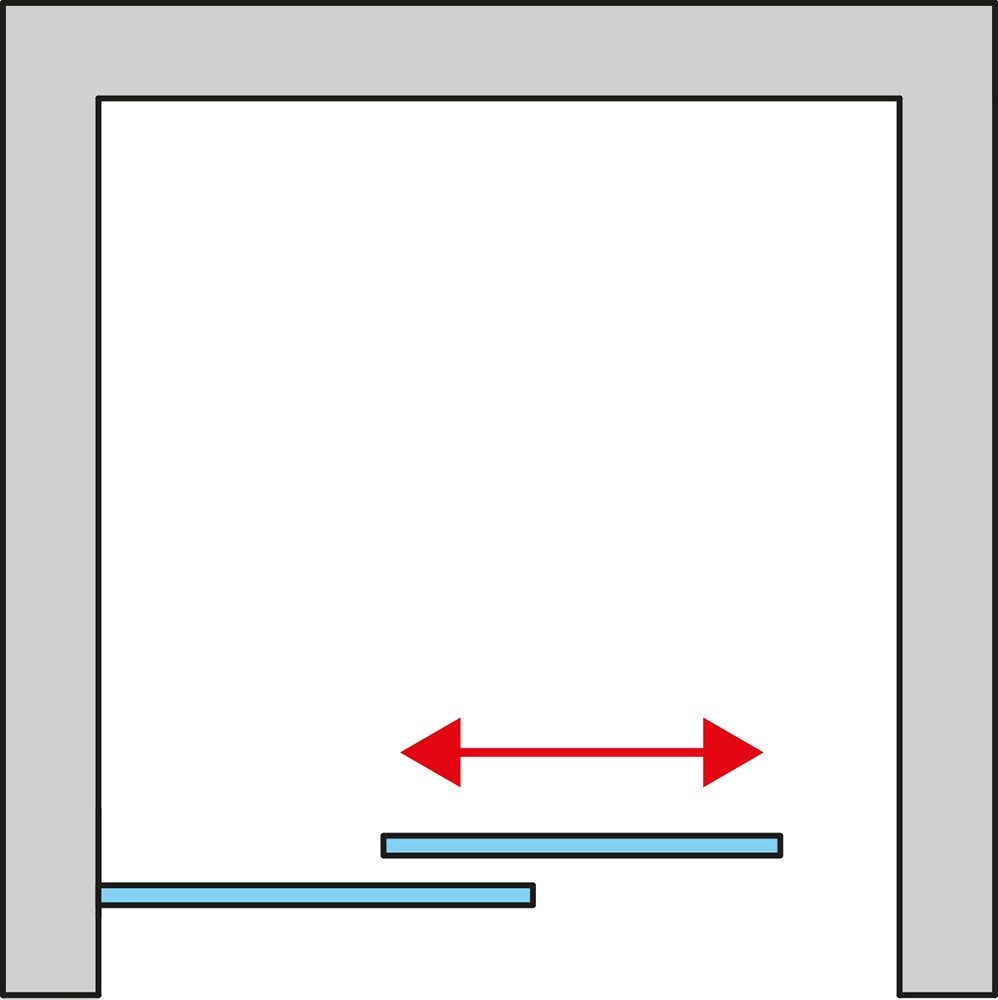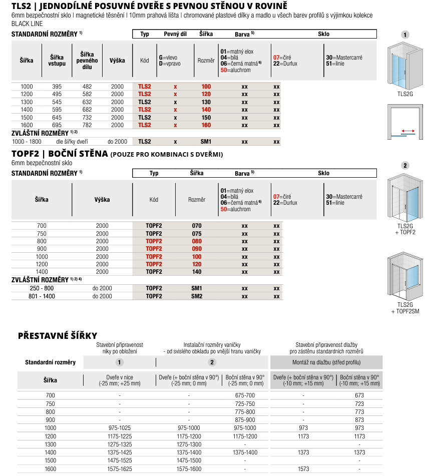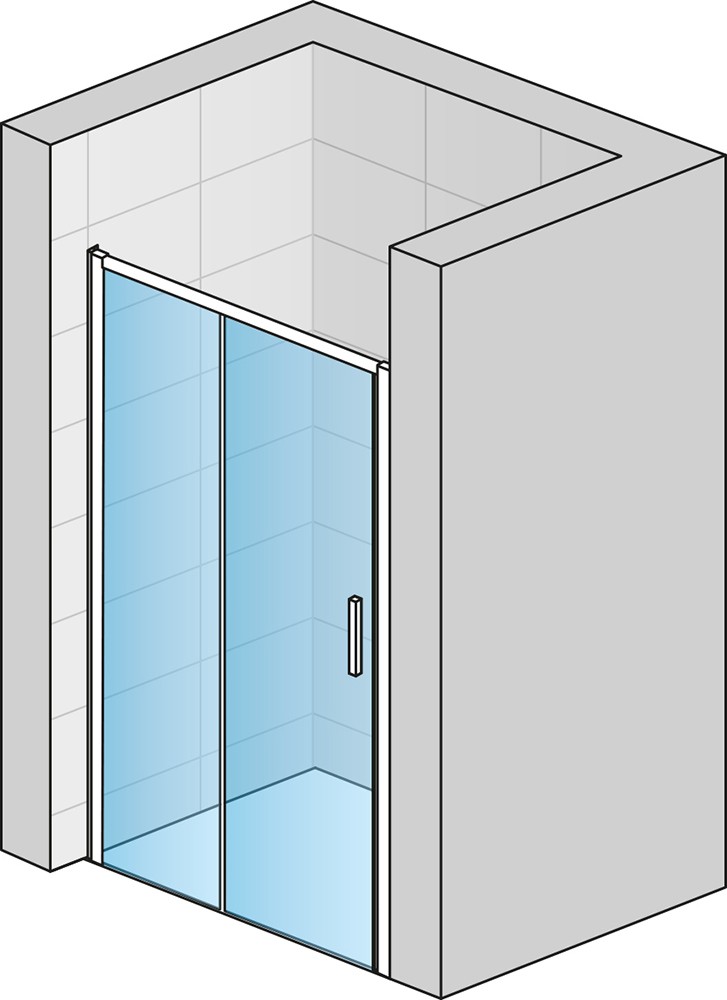- jednodílné posuvné dveře s pevnou stěnou v rovině, pevný díl vlevo - bezbariérové, do niky nebo pro kombinaci s boční stěnou v 90°