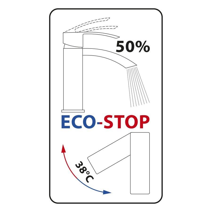 Systém úspory spotřeby vody a energie: V základní poloze vytéká studená voda, postupným otáčením páky doleva se přidává voda teplá. Průtok vody je regulován zvednutím páky baterie.